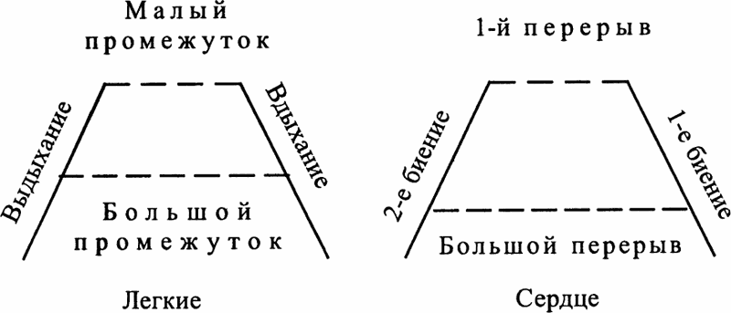 Дыхание, или циркуляция воздуха, производится с промежутком между вдыханием и выдыханием, когда воздух поступает в легкие и обратно. Первый период, когда воздух вдыхается в легкие и после короткого промежутка – выдыхается, что и представляет второй период. Маленькое наблюдение укажет, что сердце вторит ему, но с более частыми промежутками, в минуту считается 20 дыханий и 60 биений. Но схема дыхания аналогична схеме сердцебиения с большими и меньшими перебоями.