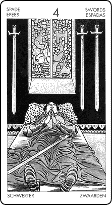 Традиционно Четверка Мечей известна как карта передышки в борьбе. В астрологии она ассоциируется с третьим десятком градусов Весов, где Юпитер, бог удачи и развития, обретает новую жизнь.