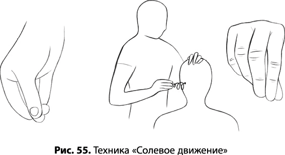 Держите руки близко к пораженному месту и медленно делайте такое движение, как если бы вы что-то солили. Рука должна быть направлена вниз, чтобы энергия стекала с пальцев на пораженный участок. Проводите большим пальцем от мизинца до указательного пальца, как бы срезая энергетические ниточки. Их длина должна быть не более 5 сантиметров (рис. 55).
