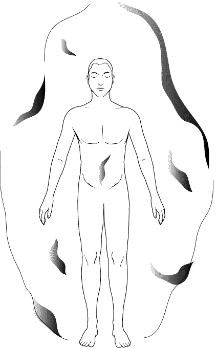 Кроме того, на ауру огромное воздействие (более сильное, чем принято думать) оказывает эмоциональное и ментальное состояние. Продолжительный стресс, эмоциональные травмы, психические расстройства и неуравновешенность, потрясения, беспокойство, страх и другие негативные явления ослабляют поле ауры. Ослабленная аура приводит к утечке энергии. Вы быстрее устаете. Если это происходит длительное время, то в поле ауры образуются отверстия и разрывы. Наряду с другими расстройствами начинают возникать проблемы с физическим здоровьем. На рис. 42 показано, как выглядит ослабленная аура: в ней можно увидеть разрывы и темные пятна, ее форма зыбкая и асимметричная.
