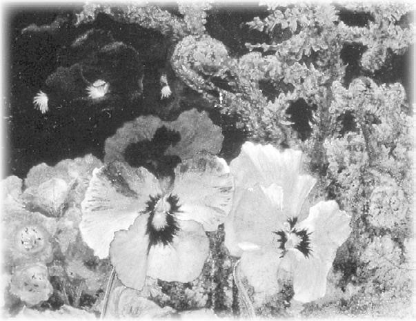 Джон Бретт (1831–1902). Анютины глазки и побеги папоротника. 1862. Во многих цветках растений, и в анютиных глазках, и в голубом цветке Новалиса можно разглядеть тонкие личики