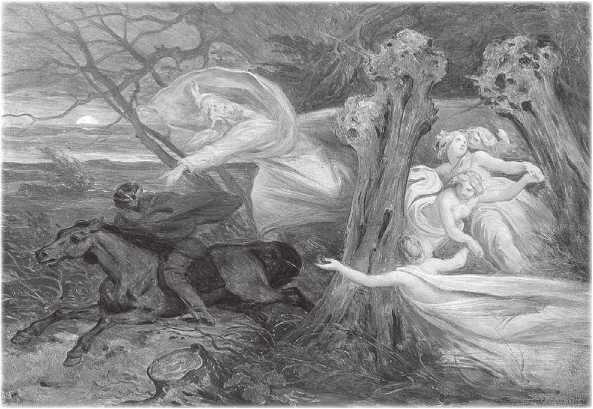 Лесной царь Гёте был, собственно, не королем ольховых рощ[26], а королем эльфов, elverkonge или ellerkonge, и о нем рассказывается в датской народной балладе «Господин Олуф», переведенной на немецкий язык Иоганном Готфридом Гердером. Так в переводе Ellerkonge, король эльфов, превратился в Erlenkonig, король ольхи, причем первая часть слова полностью совпадает с северогерманским словом Eller (ольха). А ужасное убийство совершила из мести принцесса эльфов, дочь короля, а вовсе не сам король. Дело в том, что за день до своей свадьбы господин Олуф повстречался ей в лесу, но не позволил завлечь себя в танец, за что и был наказан смертью.