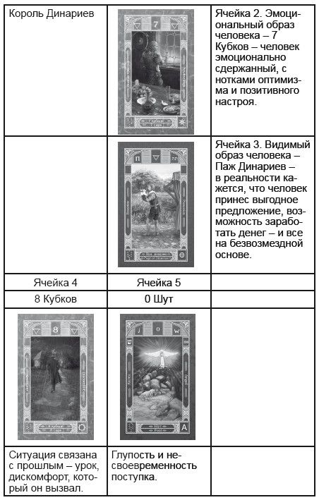 Расклад дал нам описание человека и то, «откуда» это описание пришло. А пришло оно, как видите, из ячеек 4 и 5 – из прошлого, из воспоминаний, связанных с тем, как Король динариев использовал (обманул, облапошил) вопрошающего. То есть, другими словами, образ, который мы видим в раскладе, – память о конкретном человеке: негативный жизненный опыт, который проецируется на настоящее. И эта проекция весьма искажена – в раскладе, уточняющем Персону, в изобилии присутствуют карты Двора, то есть образы других персон. Как это понимать? Человек пытается оценить другого человека не так, как он себе представляет, а на примере других людей.
