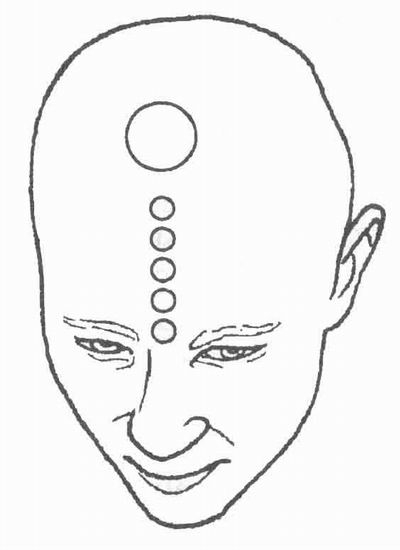 Расположение двух физических глаз и пяти психических глаз. На макушке, над седьмым глазом расположена коронная чакра.