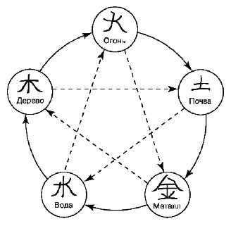 Цикл разрушения элементов всегда ставится в противовес циклу порождения. Иными словами, свойства одного элемента несовместимы со свойствами другого, и поэтому разрушаются в случае их взаимодействия: Вода разрушает Огонь, Огонь – Металл, Металл – Дерево, Дерево – Землю, а Земля – Воду.