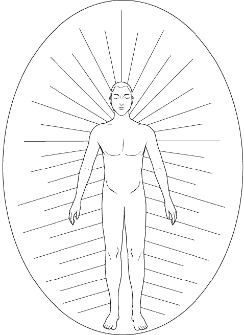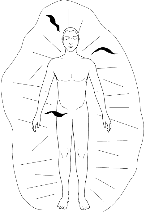 Когда вы начнете зрительно воспринимать ауру, она, скорее всего, будет для вас иметь вид поля, плотно прилегающего к физическому телу. Это особое поле в значительной мере отражает состояние физического здоровья человека. У здорового человека энергия физического тела проявляется в ауре в виде исходящих энергетических лучей. Эта энергия может быть разных цветов, но по форме она скорее напоминает не облако, окружающее тело, а потоки энергии, исходящие от него (см. рис. 40). Цветные участки часто выделяются на общем фоне поля ауры.