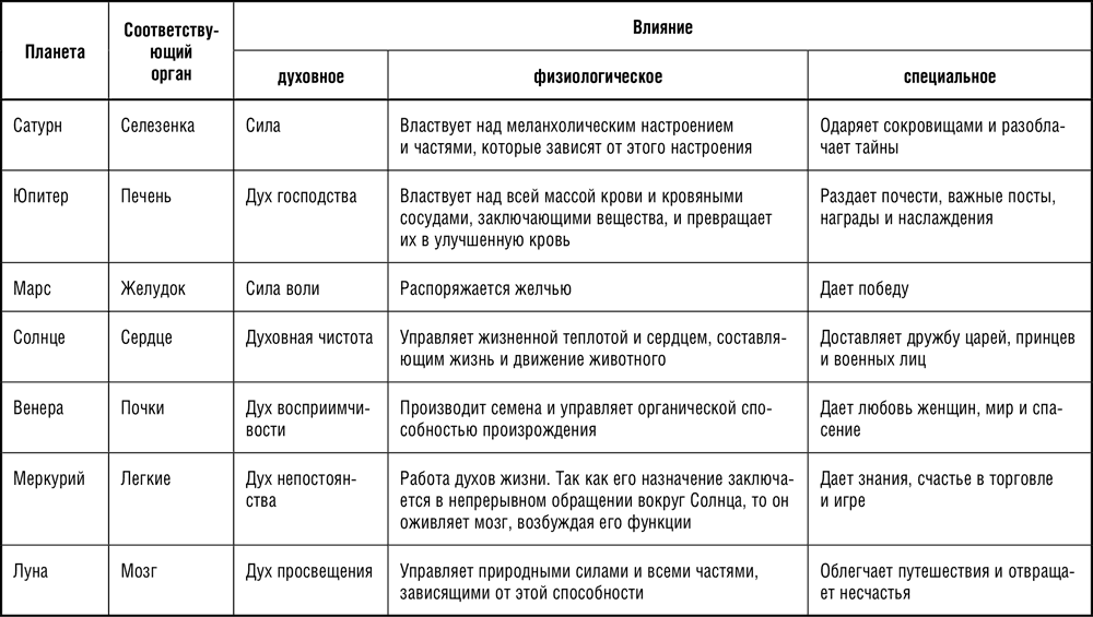 Мы закончим это изложение таблицей соотношений, как они понимались в герметических преданиях XVI века. в этой таблице находится все, относящееся до особых значений, придаваемых планетам.