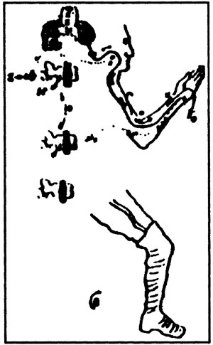 Немецкий офицер ударяет по точке А. Тотчас же происходят оба только что описанных нами явления. Ощущение приходит в серый центр З. С. спинного мозга, где и возбуждает рефлективный импульс.