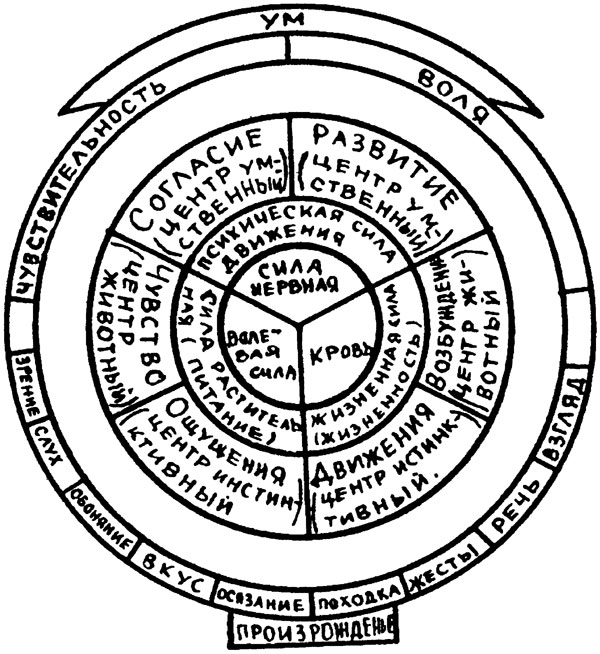 Хотя сравнение человеческой психики с садом и дало нам возможность понимать Платона и Фабра д’Оливе, но оно обладает одним важным недостатком, представляя человеческие способности неподвижными, между тем как на самом деле все психические способности человека находятся в непрерывном действии. Ввиду этого лучше представить себе названия человеческих способностей написанными на кругах, вращающихся около своей оси.