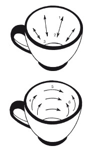 Затем нужно взять чашку в левую руку и, сосредоточив внимание на вопросе, три раза повернуть чашку по часовой стрелке так, чтобы гуща равномерно распределилась по стенкам. Вращать чашку нужно энергично, чтобы гуща покрыла ее внутреннюю поверхность почти до краев.