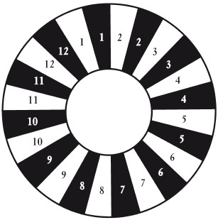Для проведения гадания необходимо положить в центр круга (рис. 5) острием на незаштрихованный сектор номер 1 нож, задать вопрос: «Что меня ожидает?» и раскрутить его. Остановившись, нож укажет на какой-либо сектор. Если он окажется не заштрихованным, вас ожидают благоприятные события, если заштрихованным – будьте готовы к неприятным изменениям в жизни.