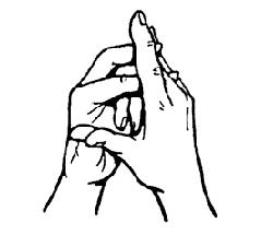 Методика исполнения: соединить кончики больших пальцев. Соединить кончики мизинцев. Согнуть безымянные пальцы обеих рук и направить их вовнутрь. Указательный палец левой руки расположить между средним и безымянным пальцем правой руки. Выпрямить указательный палец правой руки.