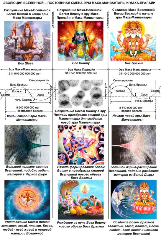 Согласно индуистско-буддийской мифологии, «Общая схема мироздания» выглядела следующим образом. Вселенная существовала в постоянной «СМЕНЕ ПЕРИОДИЧНОСТИ БЫТИЯ» в течение 622 080 000 000 000 «земных» лет. Где во Вселенной постоянно менялась эра «МАХА-МАНВАНТАРЫ» и эра «МАХА-ПРАЛАЙИ».