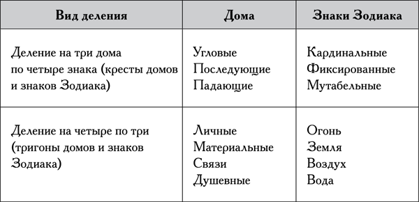 Соответствие деления домов на сферы деятельности и кресты делению знаков Зодиака на стихии и качества приведено в табл. 21.