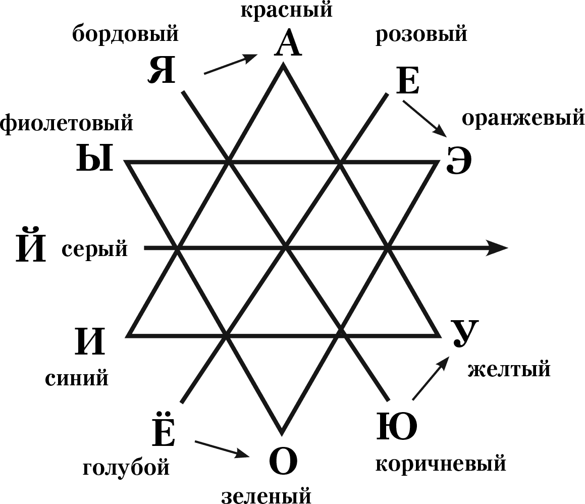 На рисунке гласные буквы соотнесены со спектром цвета. Движение начинается с буквы «Я» и по часовой стрелке идет к букве «Ы».