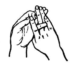 Методика исполнения: средний и безымянный пальцы правой руки кладут на аналогичные пальцы левой руки. Мизинец левой руки кладут возле основания тыльной поверхности среднего и безымянного пальцев правой руки, затем все фиксируется мизинцем правой руки. Концевая фаланга указательного пальца правой руки зажимается между большим и указательным пальцами левой руки.