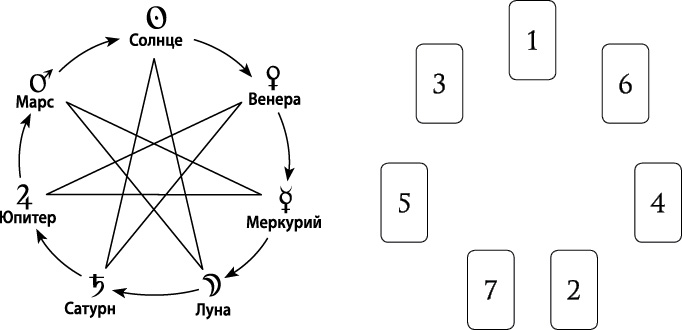 Мы видим рисунок Звезды Магов (или Звезды Сатурна) и схематическое расположение карт на алтаре. Первая карта, извлеченная из колоды, ложится на позицию № 1 (область Солнца). Последующая раскладка арканов производится по направлению лучей звезды – от Солнца к Луне, от Луны к Марсу и так далее (в последовательности: Меркурий – Юпитер – Венера – Сатурн). За подготовкой септенера (непосредственно звезды) следует интеграция в расклад высшей триады планет (Урана, Нептуна и Плутона). На алтаре возникает подобный схематическому изображению символ.