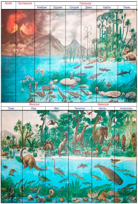 По геологическим, эзотерическим и контактерским данным «Мезозойской Эры», от 250 – до 65 млн. лет назад. В начале своего формирования «ЛЕМУРИЯ» занимала «БОЛЬШОЙ УЧАСТОК СУШИ», находящийся на территории современного Тихого, Индийского и Атлантического океана, и «простиралась от восточного берега современной Африки – по линии южнее экватора – до западного берега современной Южной Америки». Согласно вышеупомянутому биохимическому и геологическому состоянию земного шара, «РАСТЕНИЯ И ЖИВОТНЫЕ В ТО ВРЕМЯ ВНАЧАЛЕ БЫЛИ НЕЗНАЧИТЕЛЬНЫЕ ПО РАЗМЕРАМ, А ПОТОМ ГИГАНТСКИЕ. ЭТО БЫЛИ ПЕРВЫЕ ДРЕВНИЕ ХВОЙНЫЕ ЛЕСА, А ЗАТЕМ ЦВЕТКОВЫЕ РАСТЕНИЯ. А ИЗ ЖИВОТНЫХ – ЭТО БЫЛИ, ПРОИСХОДЯЩИЕ ИЗ ЯИЦ, СНАЧАЛА ПОЛЗАЮЩИЕ МЕЛКИЕ И КРУПНЫЕ ДИНОЗАВРЫ. А ЗАТЕМ, В ПЕРИОД РАСЦВЕТА ДИНОЗАВРОВ, – ЭТО БЫЛИ ГИГАНТСКИЕ НАЗЕМНЫЕ ДИНОЗАВРЫ, А ТАКЖЕ ЛЕТАЮЩИЕ ЯЩЕРЫ».