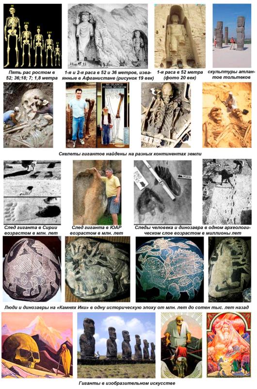 В Европе, во Франции возле Лансливиллар найдены следы «50 ОТПЕЧАТКОВ СТОП ДО 3 °CМ.», и возрастом в млн. лет. В Азии, в Сирии найдено «НЕСКОЛЬКО ОТПЕЧАТКОВ СТОП 90 ? 3 °CМ.», и возрастом в млн. лет. В Коране написано, что Аллах создал Адама ростом в «60 ЛОКТЕЙ», т. е. в «30 МЕТРОВ». В Индии, в округе Джалпайгур, найдены «СЛЕДЫ 60 ? 28 СМ.», и возрастом во много млн. лет. В Туркменистане, у подножия горы Кугитангтау и на Ходжапильском плато, обнаружено «ОКОЛО 1000 ОТПЕЧАТКОВ СТОП ДО 6 °CМ.» рядом со следами динозавров, возраст которых составлял 150–100 млн. лет. В Африке, в ЮАР, в провинции Трансвааль, и на острове Шри-Ланка, были найдены «ГИГАНТСКИЕ ОТПЕЧАТКИ СТОП РАЗМЕРОМ 130 ? 6 °CМ.», и возрастом в много млн. лет. В Северной Америке, в Западной Верджинии, был найден «ОТПЕЧАТОК СТОПЫ РАЗМЕРОМ В 45 СМ.», и возрастом в сотни млн. лет. В штате Нью-Мексико, обнаружено «13 СЛЕДОВ ГОЛЫХ СТОП РАЗМЕРОМ 70 ? 3 °CМ.», и возрастом в 280–205 млн. лет. В штате Техас, в «Долине великанов», найдены «ОТПЕЧАТКИ СТОП ДО 3 °CМ.» рядом со следами динозавров, возраст которых составлял сотни млн. лет. В Юго-Западной Африке на реке Акаванга обнаружен топор «ГИГАНТА» весом в 150 кг. и возрастом в 49 млн. лет.