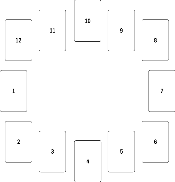 Начните с положения девяти часов и раскладывайте карты дальше, двигаясь против часовой стрелки вокруг колеса.