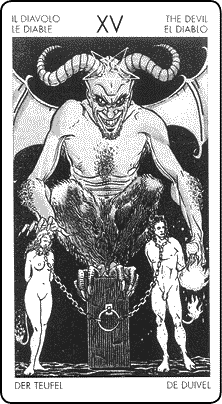 В Таро карта Дьявол представляет собой одну из гротескных версий карты Влюбленные, пойманных в ловушку собственных ошибочных приоритетов и порабощенных ими. Подобно злому владельцу театра марионеток, Дьявол знает, как управлять ими. При этом молодая пара и сама выглядит несколько дьявольски: их хвосты горят, а огонь кажется зловещим напоминанием о тех деревьях, которые стояли за ними на карте Влюбленные.
