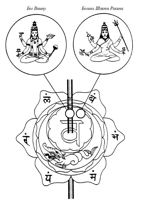У тантрического символа свадхистханы шесть лепестков алого цвета. Внутри него еще два лотоса (рис. 3.3). В основании среднего лотоса сияет серп луны, в котором находится макара, существо похожее на крокодила с закрученным хвостом, напоминающим свернутую кундалини. Это водяное животное, которое символизирует всепоглощающие желания и страсти – их необходимо усмирить, чтобы продвигаться дальше. Для меня оно ассоциируется с животными инстинктами, которые скрываются в бездонных глубинах человеческого бессознательного.