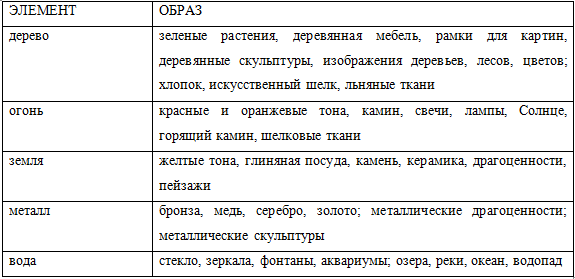 Для создания энергетического и эмоционального баланса фэн-шуй изобилия использует пять основных элементов, наблюдаемых в природе: дерево, огонь, земля, металл и вода. Энергии, которые создают и поддерживают человеческую жизнь, скоординированы этими пятью элементами. Как считается, прежде чем, мы рождаемся на этой Земле, мы существуем, как пять элементов. Когда наши родители намереваются родить нас, они выпускают в мир определенную ментальную вибрацию, которая вызывает наше рождение. Эта вибрация стимулирует пять элементов бытия. Первая, жизненная вибрация любви, направляется в сердце (элемент огня, связанный с красным цветом) – и оно начинает биться. Желание выжить создает легкие (элемент металла, связанный с белым цветом) – и они начинают дышать. Третья вибрация творит живот – для того, чтобы принимать питание от Земли (элемент земли, связанный с желтым цветом). Четвертая вибрация, связанная с пищеварением, творит печень (элемент дерева, связанный с зеленым цветом) – и она очищает весь организм. Наконец, почки удаляют ненужные отходы (элемент воды, связанный с черным цветом). Сотворенный человек сопряжен с энергетикой пяти жизненных органов.