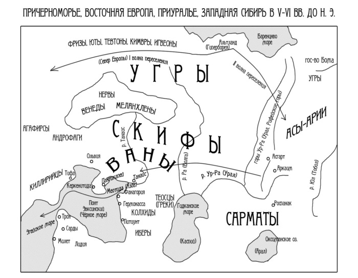 Современный исследователь Владимир Щербаков приводит множество доказательств в пользу того, что предками германцев и скандинавов были асы, которые жили бок-о-бок с родственными им ванами – предками русов. В Старой Ниссе (Туркмения) находилась столица асов – Асгард.