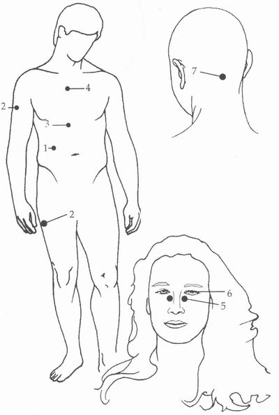 Четыре местоположения: срединные точки с наружной стороны бедер и внешние стороны верхних частей предплечий.