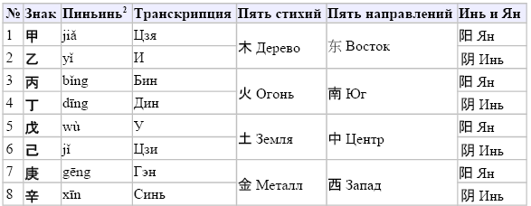 Расположены в следующем порядке: ???????????????????. Используются в сочетании со знаками двенадцатеричного цикла. Происхождение системы до конца не выяснено. Чаще всего совместное использование двух циклов исчисления объясняется как символ взаимодействия Инь и Ян, Неба и Земли. Другим сравнением подобного рода регулярно выступает переплетение вертикальных и горизонтальных нитей в ткани.