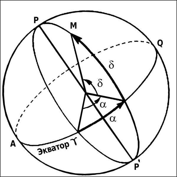 1. Склонение (?) – это расстояние, отсчитываемое от экватора до данной точки М по большому полукругу, проведенному через эту точку из полюса мира.