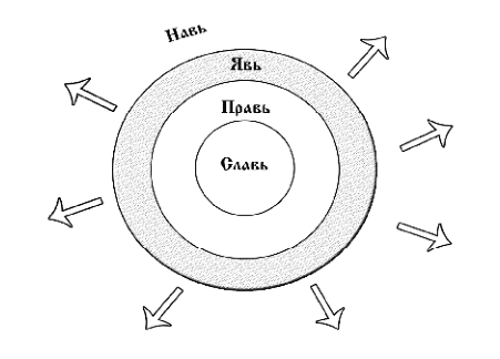 Я вообще разделяю мироздание на 4 области: Навь, Явь, Правь и Славь. Внешняя зона это область Нави. Это такой неявленный мир и как его еще называют — бездна, большой астрал, хотя он все в себя включает то, что находится дальше всего от Бога, на периферии. В центре я помещаю первозданный разум, абсолют, а то, что дальше, на периферии, самые дальние области, это как раз области темных миров или, как их в классическом мистицизме называют, области демонических сил, нижний, темный астрал.