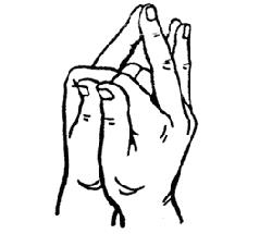 Методика исполнения: мизинец, безымянный и указательный пальцы правой руки в согнутом положении соединяются с аналогичными пальцами левой руки. Средние пальцы обеих рук соединены и выпрямлены. Большие пальцы сомкнуты вместе боковыми поверхностями.