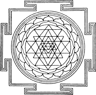 Самое время обратиться к мандале Шри Янтра, тесно связывающей нас с энергией изобилия. Шри Янтра мандала (графический вспомогательный посредник при медитации) – основная мандала индийской и буддийской традиций – это усложненный и усовершенствованный вариант гексаграммы. Из девяти взаимно пересекающихся, взаимно проникающих друг в друга треугольников внутри сложного обрамления получается изображение Шри Янтры.
