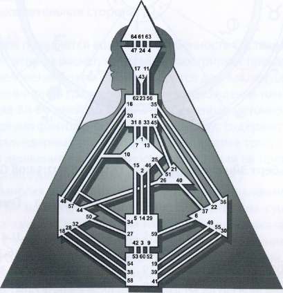 Прежде чем перейти к конкретному примеру, рассмотрим структуру Бодиграфа. Геометрические фигуры в нем — треугольники и четырёхугольники — называются центрами, их всего девять. Каждый из центров раскрывает конкретную жизненную тему. Графическое построение предполагает различные возможности соединения. Центры связываются между собой "улицами", которые называются каналами. (Речь идёт о 32 каналах плюс особая система шести каналов, образующихся из четырёх ворот.) Количество каналов, ведущих к определённому центру, различно — поэтому есть более сложные и более простые центры. Каналы, соединяющие центры между собой, на обоих концах отмечены цифрами.