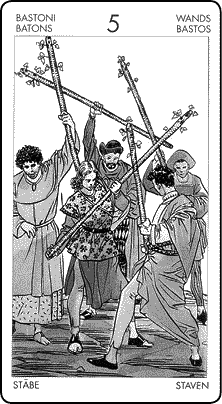 Пятерка Жезлов традиционно известна как карта борьбы; она указывает на такие качества, как неорганизованность и разъединение. Пять фигур на этой карте стараются работать вместе, но работа не идет гладко. Каждый участник группы изо всех сил старается найти свое место. Как внешние наблюдатели, мы видим, что эти пятеро в шаге от того, чтобы сформировать звездообразную композицию своими жезлами. Поскольку они не могут плодотворно общаться, складывается конфликтная ситуация, ведущая их к соревнованию и хаосу.