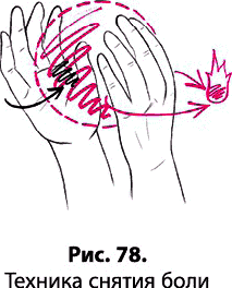 Представьте себе болевую зону в виде области, наполненной красным туманом. Поставьте руки с двух сторон от болевой точки, спереди и сзади. Та рука, что находится спереди, работает по принципу пылесоса: вытягивайте ей туманное облако и сжигайте, раз за разом. Одновременно той рукой, что сзади, подавайте взамен синий или зеленый цвет (по собственному вкусу) (рис. 78).