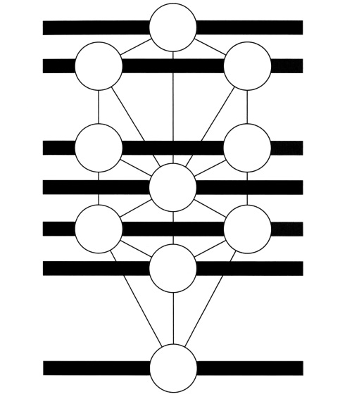 Каббалистическое Древо жизни, которое содержит десять сфирот (круги), двадцать два пути (линии, соединяющие круги), три вертикальных столпа и семь уровней (горизонтальные линии)