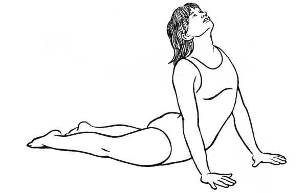 Лягте на живот, согните руки и положите ладони под плечи. Не используя руки как поддержку, медленно поднимайте голову, плечи и спину так высоко, как сможете. Затем расслабьтесь. Поднимайтесь опять так высоко, как сможете, а затем с помощью рук поднимите себя немного дальше. Не выпрямляйте полностью локти, но старайтесь раскрыть грудь, держа плечи расслабленными внизу, а голову высоко. Растягивайте живот и грудь, сделайте глубокий вдох и расслабьтесь. Повторяйте так часто, как хотите (рис. 5.7).