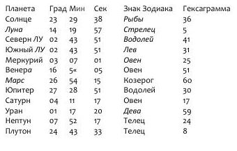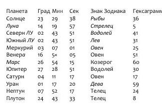 Первым практическим шагом при построении Бодиграфа будет сопоставление всех астрономических планетарных позиций на момент рождения с гексаграммами и указание соответствующих линий в них. Так возникает следующая запись: