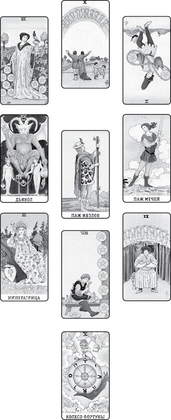 Позиция № 10, повествующая о финансовом комфорте исследуемой личности, облюбована Колесом Фортуны. Данный аркан является символом везения и довольства финансовым положением. Здесь читателя (или неопытного таролога) может смутить кажущееся внутреннее противоречие между характером позиции № 10, выпавшим арканом и настоящим (напомним – неудовлетворительным) финансовым положением нашей героини. В действительности здесь нет никакого конфликта: позиция № 10 (последняя) расклада «Денежное Дерево Сефирот» не только замыкает расклад, но и начинает его. Мы наблюдаем принцип вечного возвращения. Колесо Фортуны на позиции № 10 – это не проекция настоящей жизни нашей женщины, а информационный слепок, извлеченный из ее ближайшего будущего.