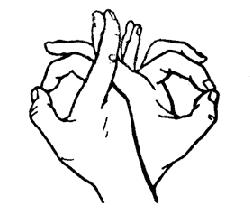 Методика исполнения: правую руку наложить на левую руку на уровне основания кистей таким образом, чтобы руки соприкасались тыльными сторонами. Соединить кончики среднего и большого пальцев каждой руки по отдельности. Сцепить кончики указательных пальцев левой и правой руки. Сцепить кончики мизинцев правой и левой рук. Безымянные пальцы правой и левой рук остаются в свободном состоянии.