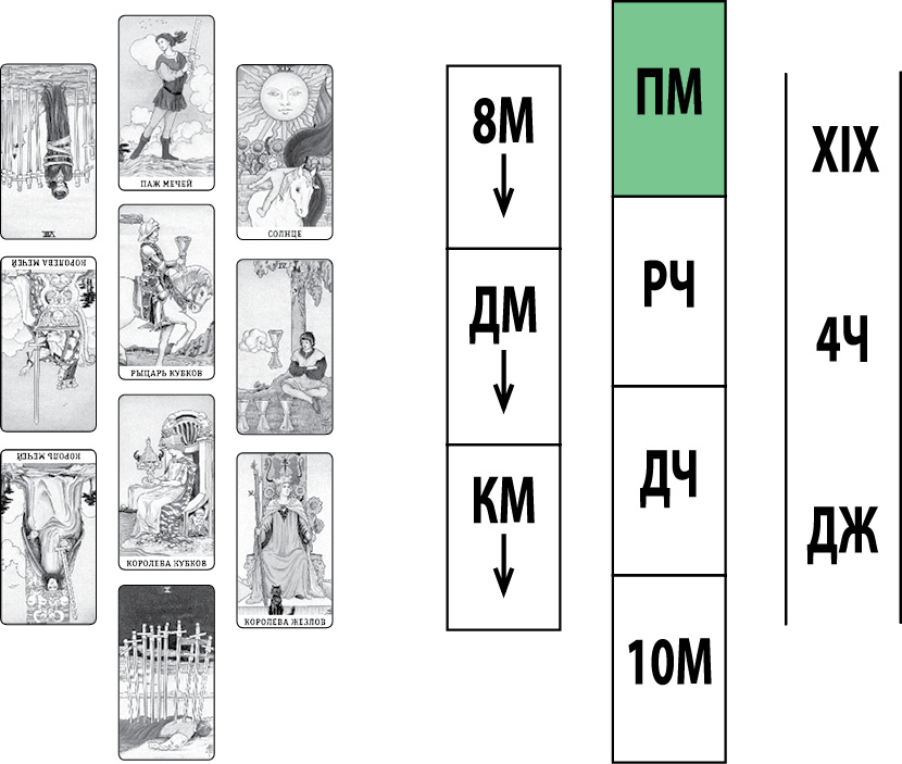 Внизу на позициях № 7, 9, 8 разместились карты Дама Жезлов, Дама Чаш и перевернутый Король Мечей. Такая концентрация в одном ряду придворных карт говорит о крайней атомизации семьи и болезненном эгоизме супругов. И жене, и мужу будущее приготовило свою отдельную жизнь. О старой совместной жизни в скором времени будет напоминать лишь подрастающий общий ребенок.