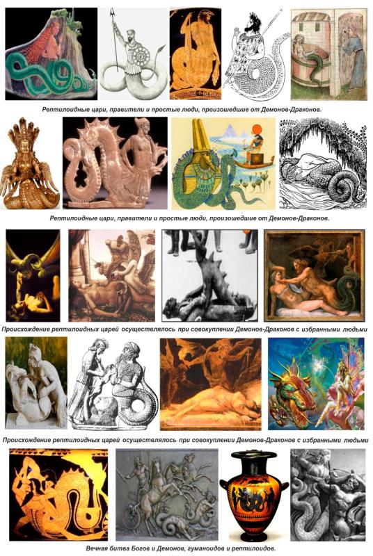 По данным исследования гербов многих городов и государств Европы, почти на всех изображены «драконы» в сочетании с разными символами. В то время как в гербах городов России «драконов» нет кроме Казанского ханства, которое этот символ, вероятно, заимствовало с Востока. Где «дракон» являлся повсеместным покровителем многих стран Юго-Восточной Азии, Индии, Китая, Таиланда и т. д. Поэтому можно предположить, что монархии Западной Европы и Юго-Восточной Азии произошли от «рептилоидов», а монархии Восточной Европы произошли от «гуманоидов», но среди них, разумеется, были многочисленные смешения. Вероятно, поэтому в «5-й АРИЙСКОЙ РАСЕ», начиная с греко-римской подрасы, германо-скандинавская и англо-саксонская подрасы являются наиболее воинственными и агрессивными, а арийско-славянская подраса более миролюбивой.