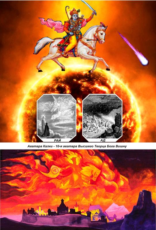 В этой связи, Бог выведет на орбиту Земли главный аргумент «АРМАГЕДДОНА» «ЦАРЬ ЗВЕЗДУ – РАДЖА СОЛНЦЕ» в виде гигантской пылающей кометы, которая будет вращаться вокруг Земли, по разным авторам, от нескольких часов – до нескольких месяцев. Главным ответственным куратором за приход «ЦАРЬ ЗВЕЗДЫ – РАДЖА СОЛНЦА», по вышеупомянутой древнеиндийской легенде, будет «АВАТАРА КАЛКИ (в христианстве – нисхождение Бога-Сына Иисуса Христа на Землю в образе «символического миража»). Он предстанет на небе могучим вооруженным всадником, сидящим на белом коне и потрясающим гигантской саблей, загнутой как хвост кометы. Каждый взмах этой сабли будет означать очередной виток очищения с планеты духовной грязи. Белый конь будет изображен с поднятой правой передней ногой, и когда он опустит ногу на Землю, планета задрожит, и все человеческое зло будет окончательно отброшено в небытие.