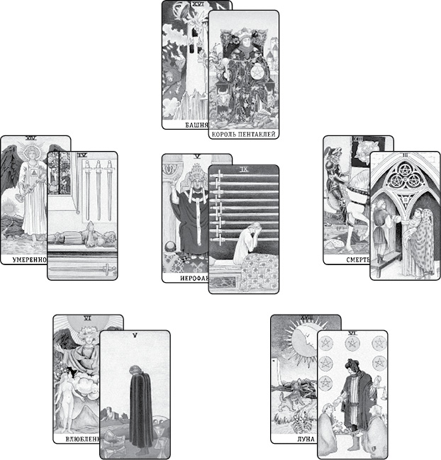 Умеренность и Солнце указывают на смерть в детстве, Влюбленные – на смерть в юности, Башня – на гибель в зрелом возрасте. Все перечисленные фазы у нашей клиентки давно в прошлом. Она пережила опасные, грозившие ей смертью моменты. Это подтверждает аркан Смерть, который в данном случае предвещает очень долгую жизнь.