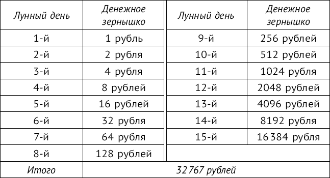 Так постепенно к пятнадцатому лунному дню вы доберетесь до суммы 16 384 рубля (а всего для ритуала вам понадобится около тридцати трех тысяч рублей). Чтобы вы не запутались, заглядывайте иногда в таблицу – а я буду напоминать вам об очередном зернышке в каждом практикуме.
