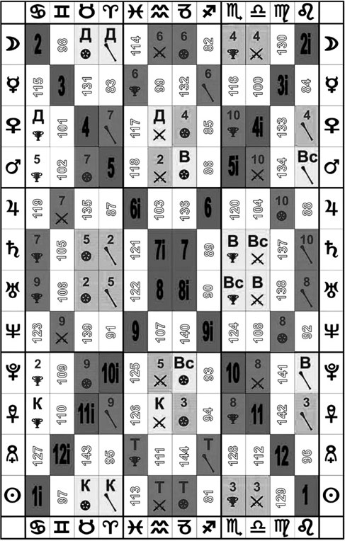 Рис. 2. Периодическая таблица 144 арканов Таро и их астрологические соответствия