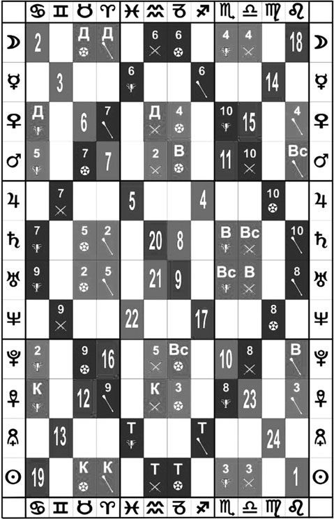 Рис. 3. Периодическая таблица астрологического Таро 80 и их астрологические соответствия (Приведена традиционная нумерация Старших арканов Таро.)