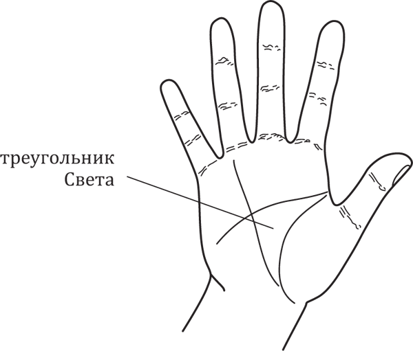 Точно так же работает энергетика треугольника, состоящего из линии Головы, линии Жизни и линии Солнца. Вот что пишет о треугольнике Света белорусский пальмистр Сергей Савоськин: «Треугольник образован линиями Жизни и Головы и линией Аполлона (света) – мощный знак, который указывает на то, что человек достиг благого состояния благодаря самоотдаче, творческой, созидательной реализации. Ведь линия света – это линия самоотдачи, линия жертвования. Актер на сцене получит на свою руку треугольник света, если будет одушевлять неодушевленное и создавать из грубой материи яркий свет. Если жертвовать неправильно или вовсе не отдавать, то треугольника не будет или он будет с нарушениями». Чем больше отдаем – тем больше получаем. Да не оскудеет рука дающего. К сожалению, в наш век потребления не так часто увидишь полноценный треугольник Света.
